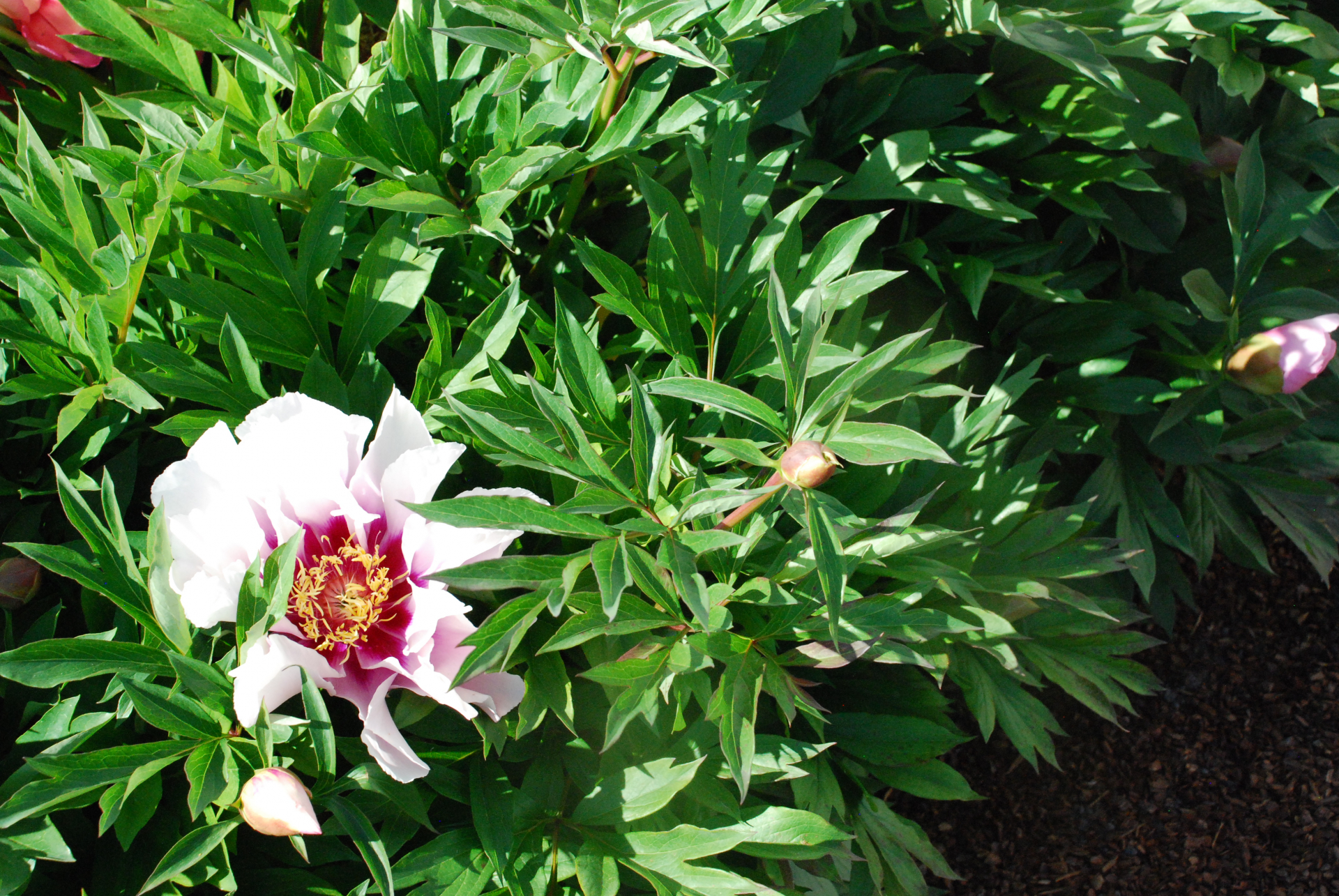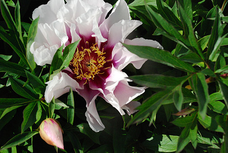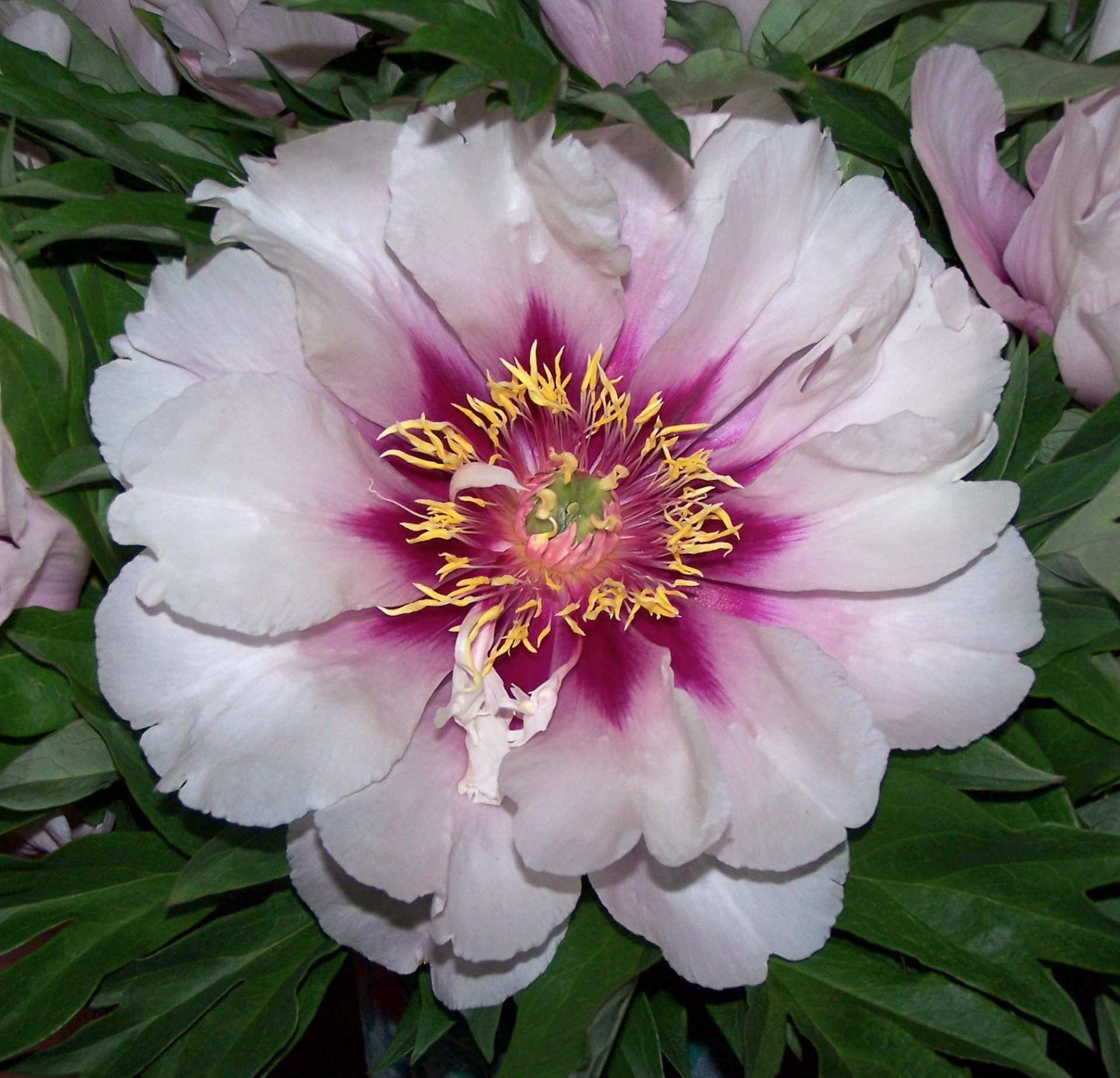 Itoh with white flowers and purple flares at the heart.