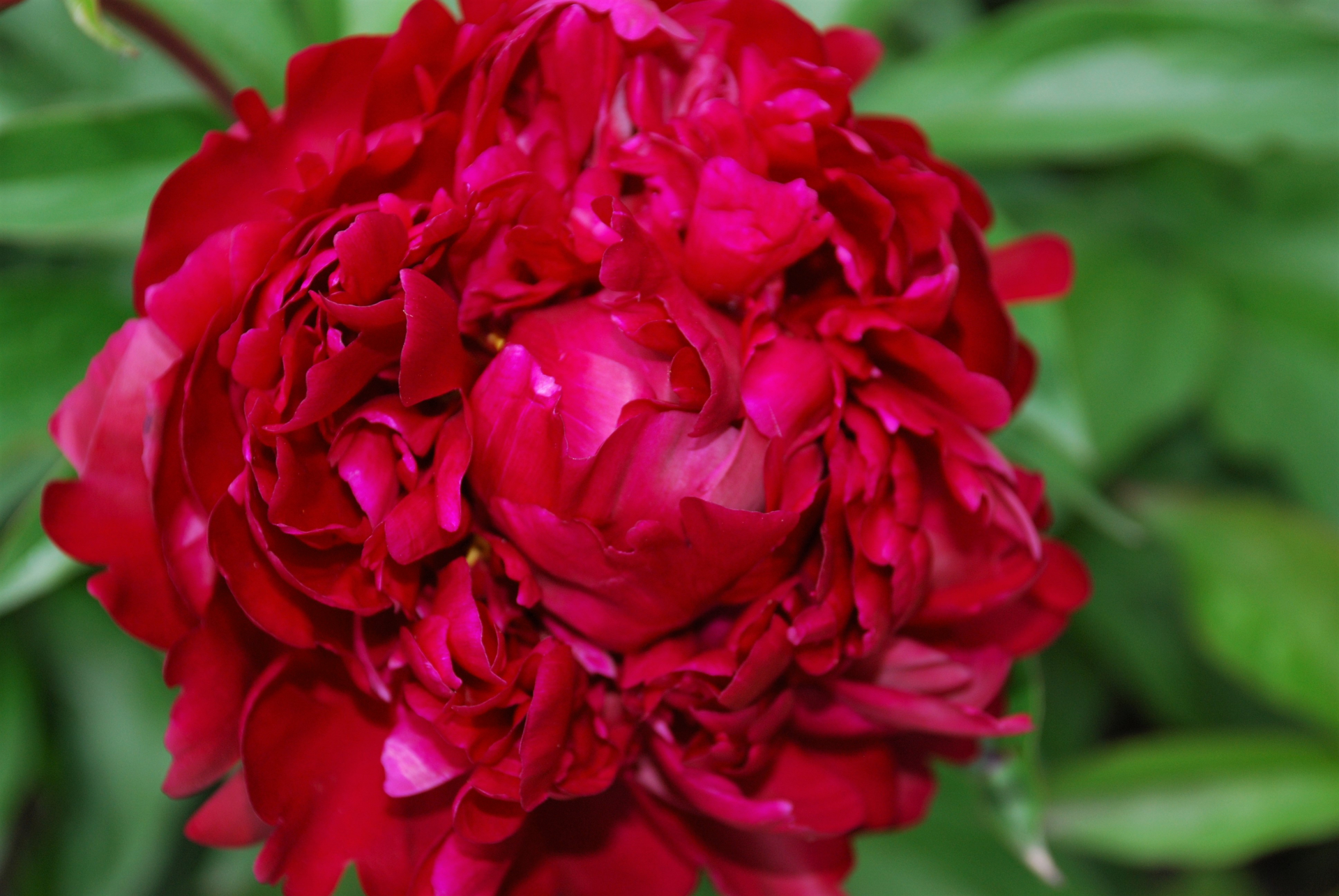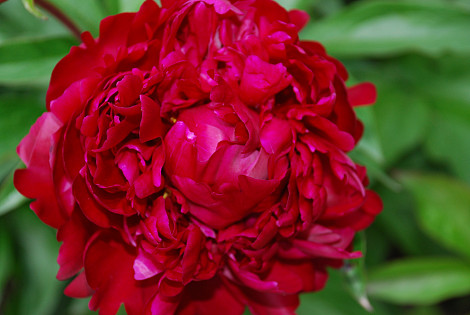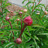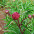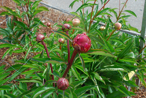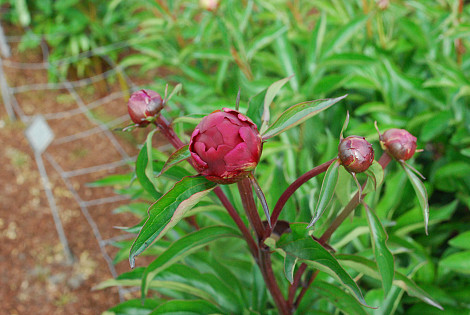 Peony with very dark red double flowers and bright yellow stamens. Good cut flower.