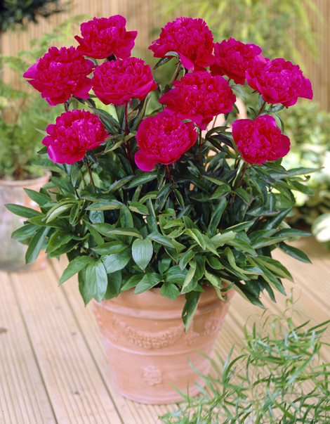 Red, herbaceous, strongly scented double-flowered peony.