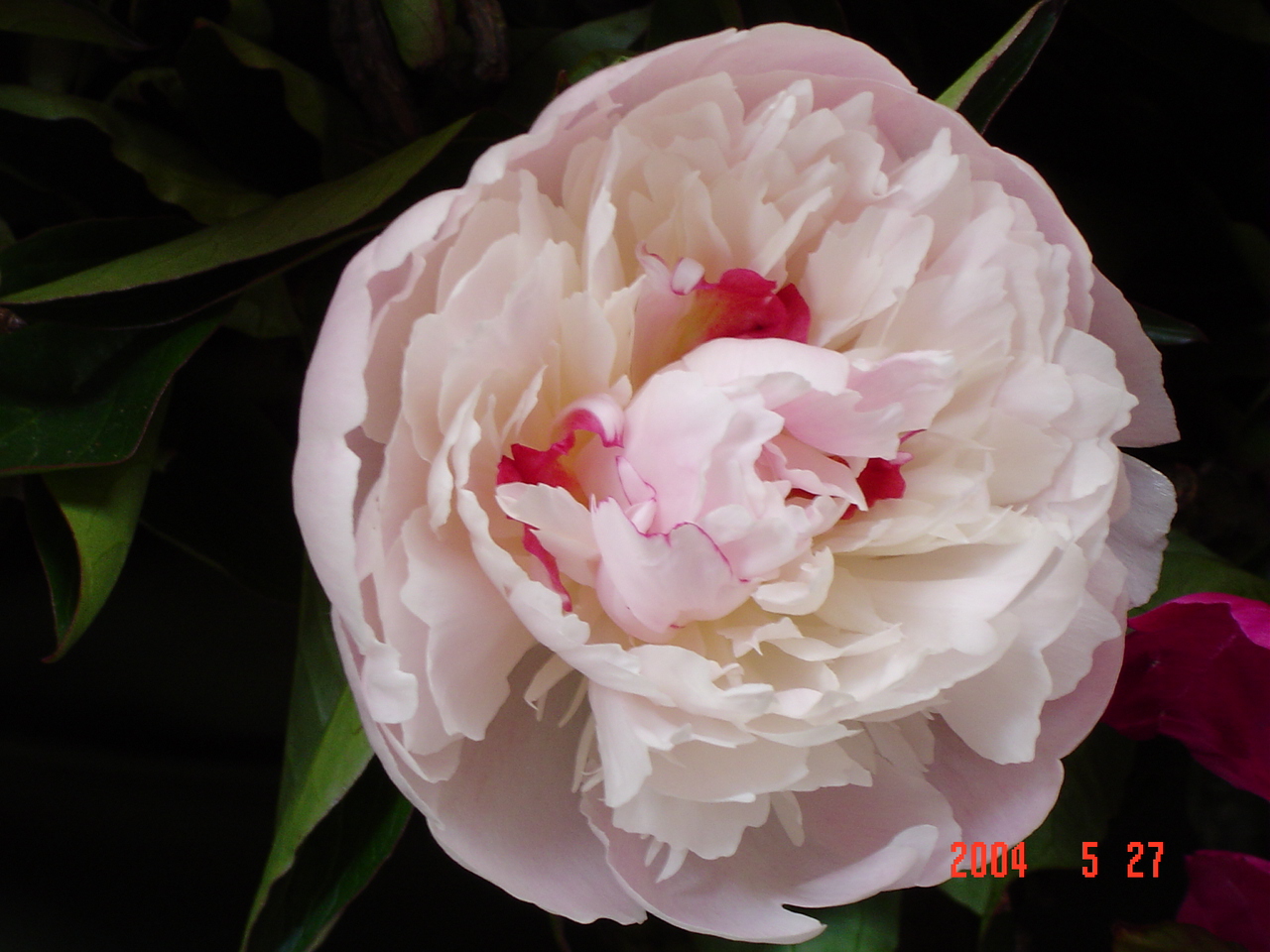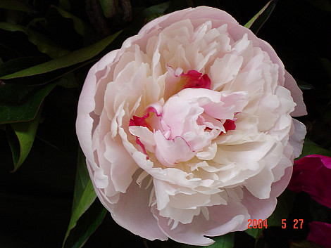 Full creamy white flower with salmon pink deep in the bloom, dark strong stems.