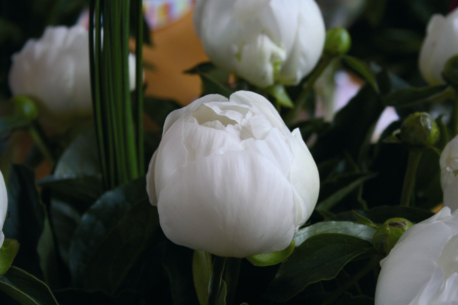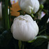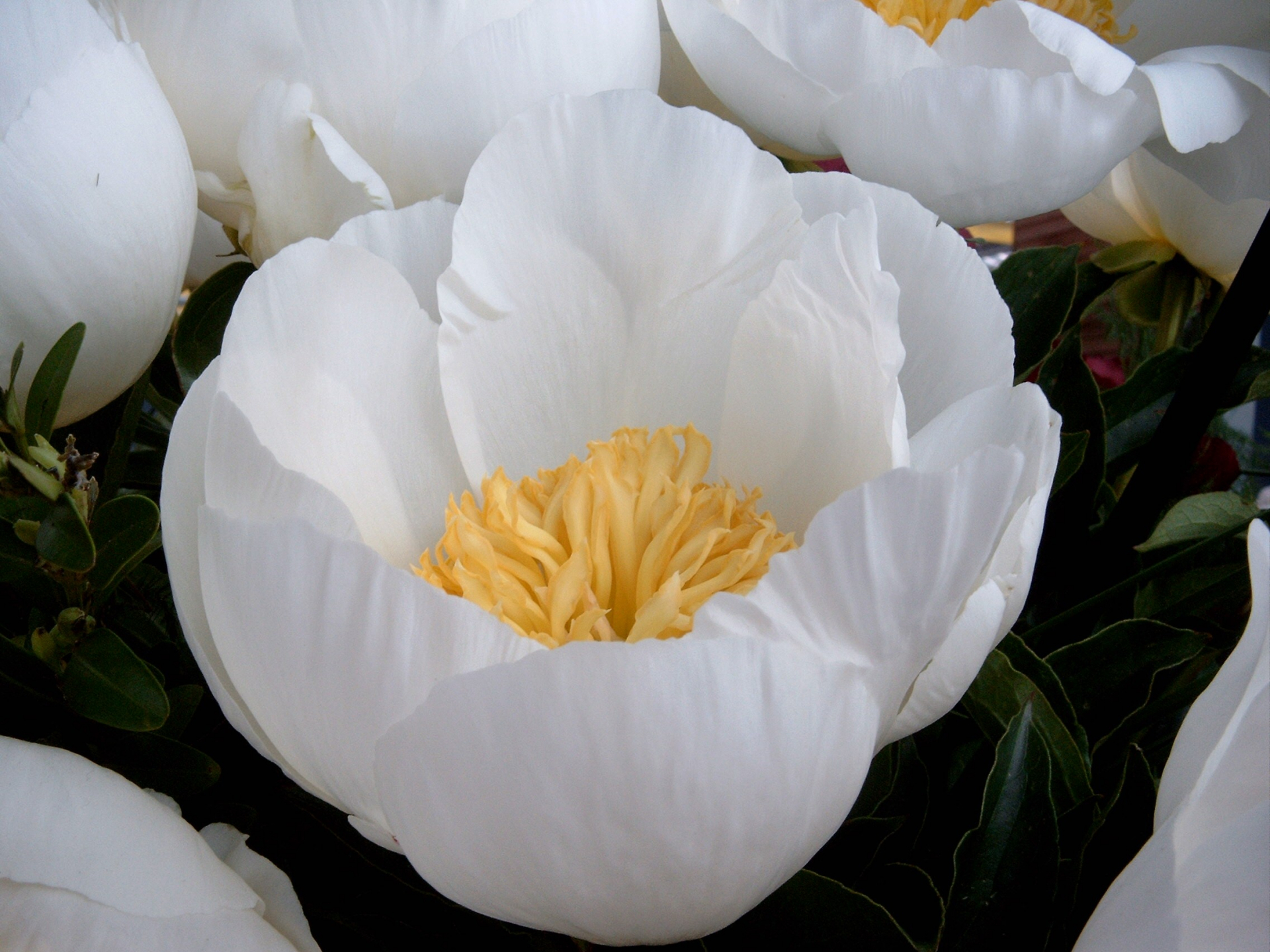 White peony with a deep yellow center. Strong stems with dark green foliage.