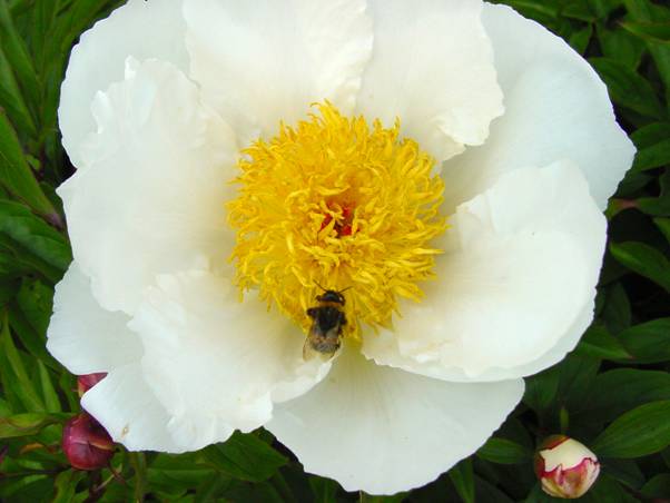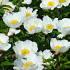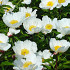 Very large white flower with a yellow stamen center, strong stems, and attractive green foliage.