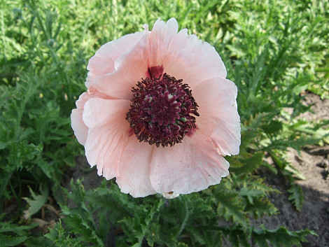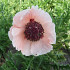 Pale pink flowers with double edges and striking red blotches instead of the usual black centre.